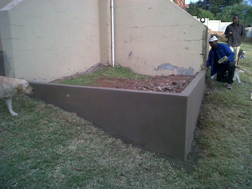 You will have noticed the poor state of the walls. Well, these walls (retaining wall for the driveway) as well as the long wall down the side of the property, were painted last year. 2 x Coats of damn fine undecoat / bonding stuff, and 2 x coats of damn fine exterior paint. Yup, 12 months ago. And at a cost of some R3500.00! So, I'm going to blast off whats left of the paint (high pressure water gun) and then we going to make a mix of very liquid Cement, Plaster Sand, and a colourant. This is applied as a plastered layer over the current finish, with a brush, and thats that.
